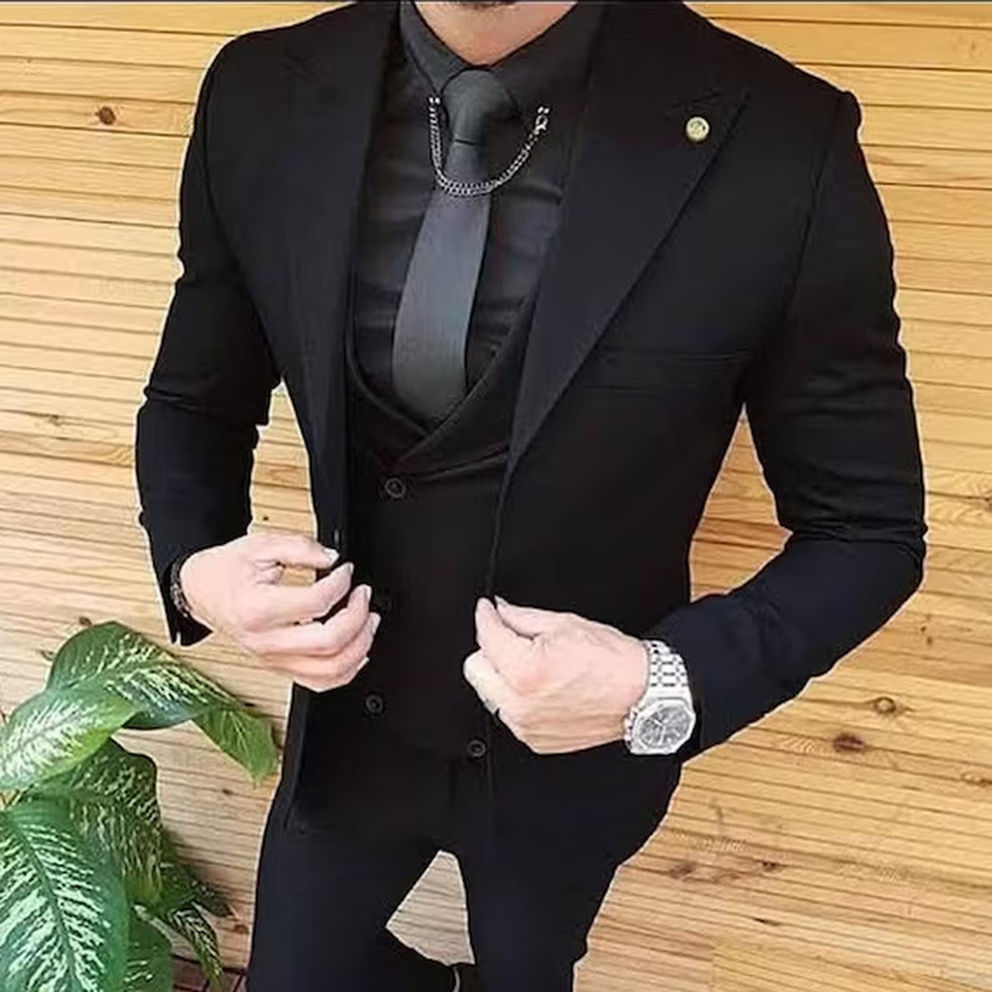 jet black 3-piece suit designed for weddings, engagements, formal occasions, and luxury party wear. This classic three-piece suit features a refined two-button blazer, making it a timeless and elegant choice for men who value style and confidence.
