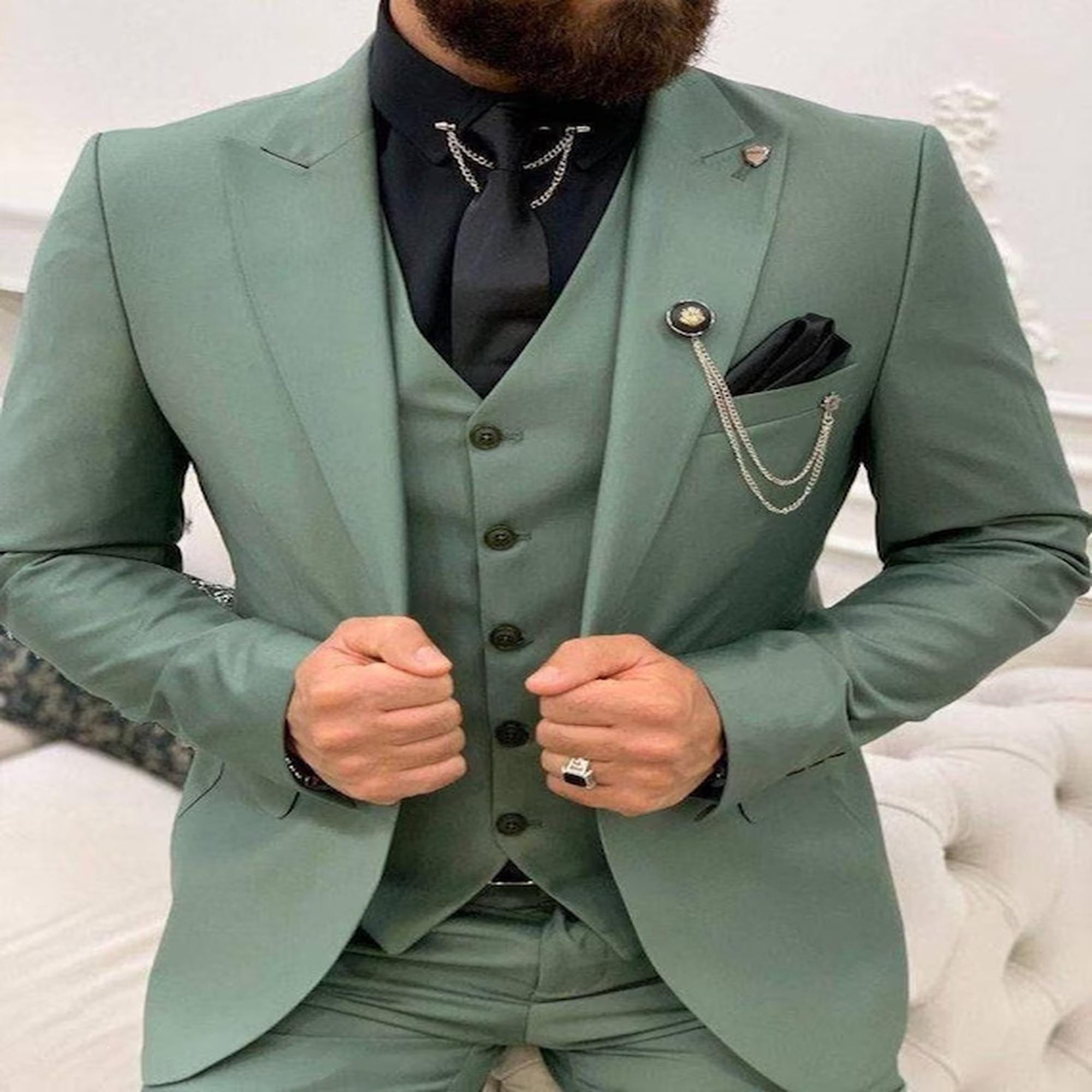 Key features: - Color: Green - Material: Imported viscose, rayon, polyester for durability and comfort - Slim-fit design for a modern silhouette - Includes blazer, trouser, and jacket - Ideal for weddings, prom, parties, and formal events - Customizable for personalized wedding or occasion wear