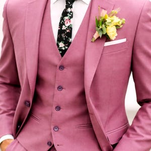 The suit includes a classic two-button jacket with notch lapels, a matching vest, and tapered pants with a flat front. The jacket features three flap pockets, a chest pocket, and four interior pockets for storing your essentials. The two side vents provide added comfort and flexibility, allowing you to move freely without sacrificing style.