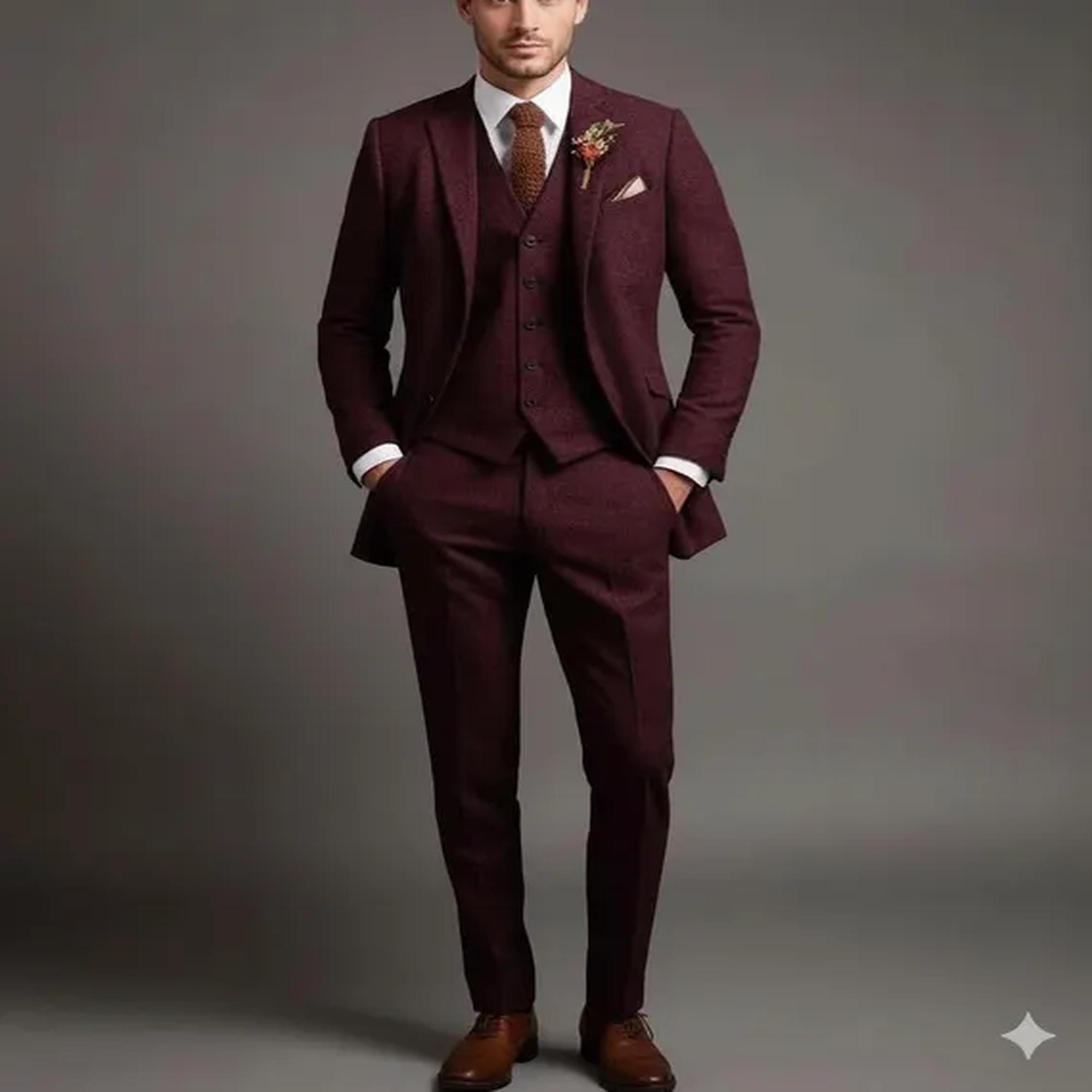 3-piece suit Maroon tweed. crafted from premium wool and high-quality satin, designed for weddings, groom wear, groomsmen, dinner parties, and classic formal occasions.