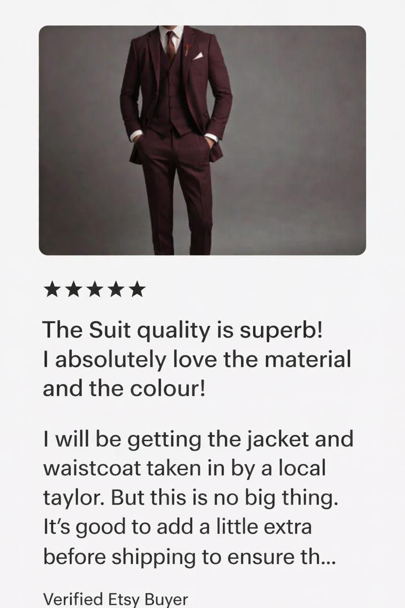 This listing includes a long trail coat, a matching vest with a crisp white fabric, and tailored pants—all designed to create a cohesive, eye-catching look. The rich burgundy color adds a regal touch, making it an ideal wedding suit or statement piece for any distinguished gentleman.