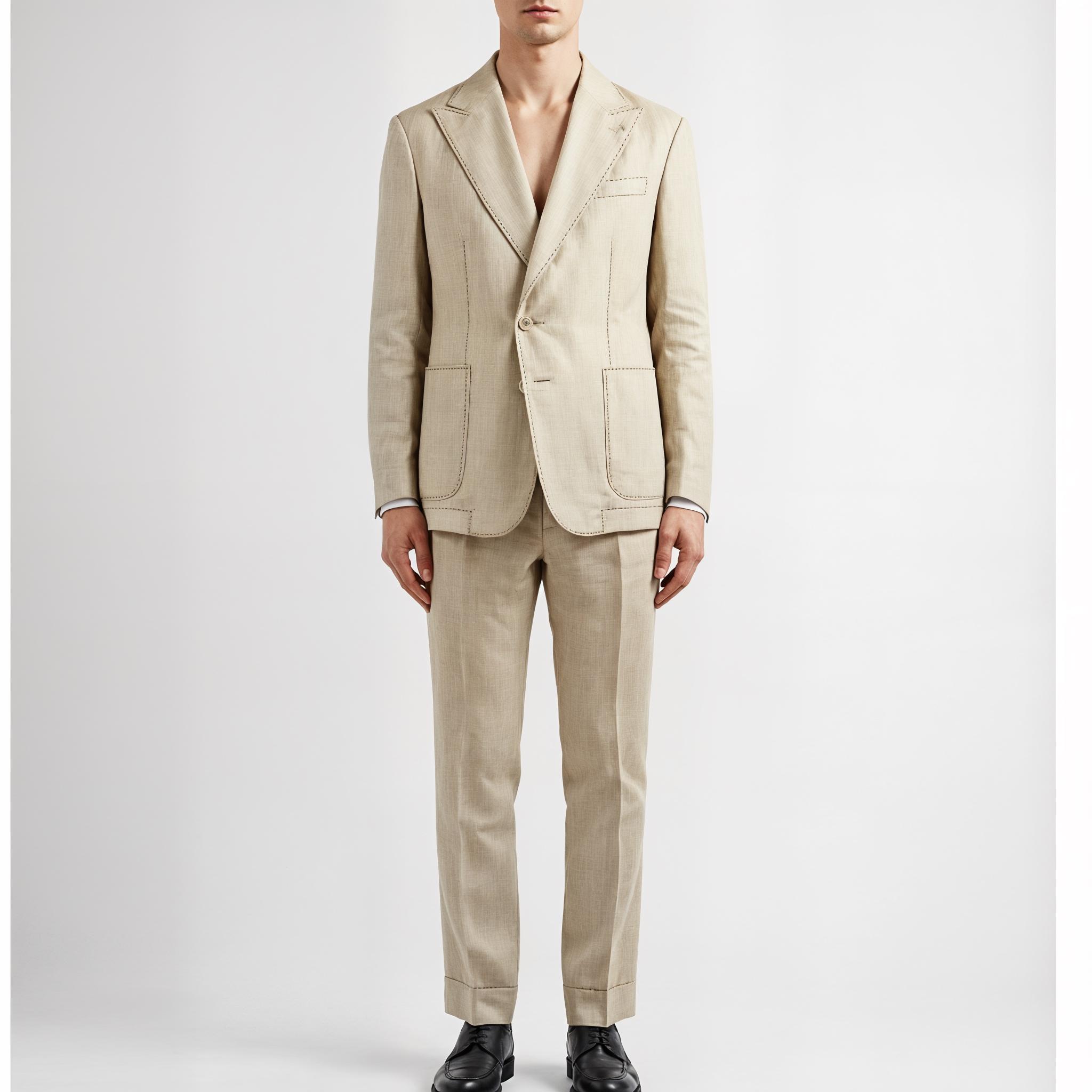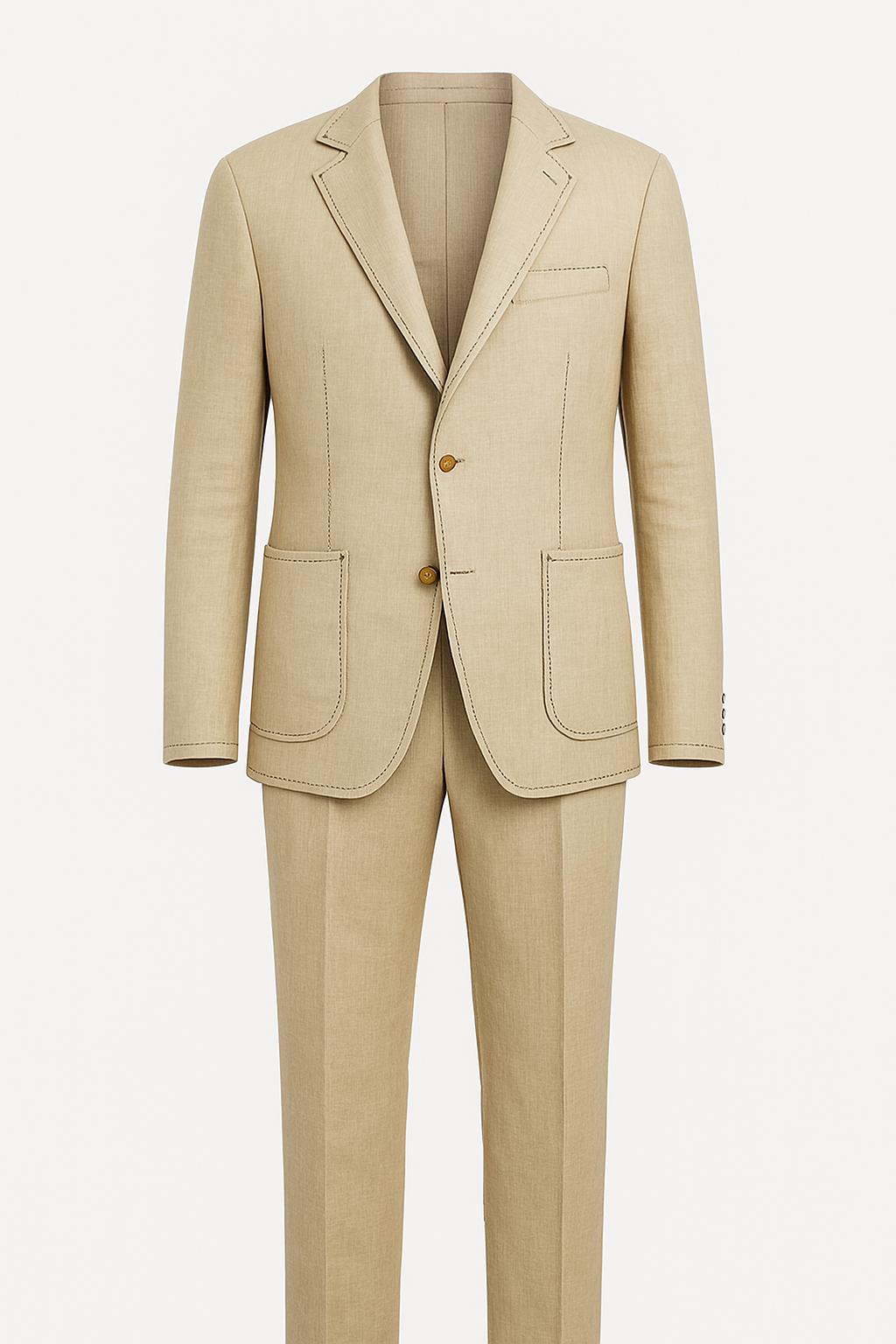 This elegant beige linen 2-piece suit with a hand-stitched design is perfect for weddings. Crafted with attention to detail, it offers a stylish and sophisticated look for special occasions. The breathable linen fabric and unique hand stitching make it comfortable and distinctive.