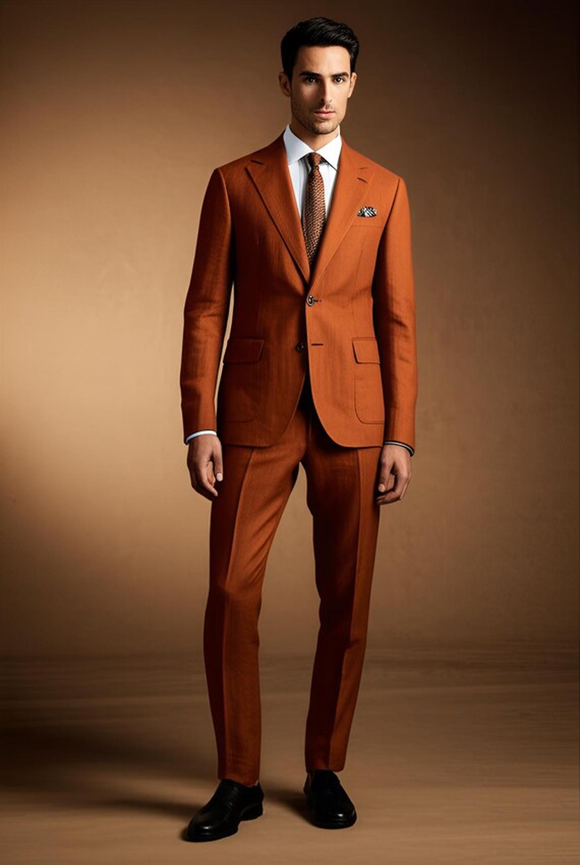 Make a confident statement with this Rust Orange Linen Men’s Suit, designed for grooms and modern men who appreciate classic tailoring with a bold, contemporary edge. Crafted in breathable linen, this suit is ideal for summer weddings, destination ceremonies, and formal celebrations where style and comfort both matter.