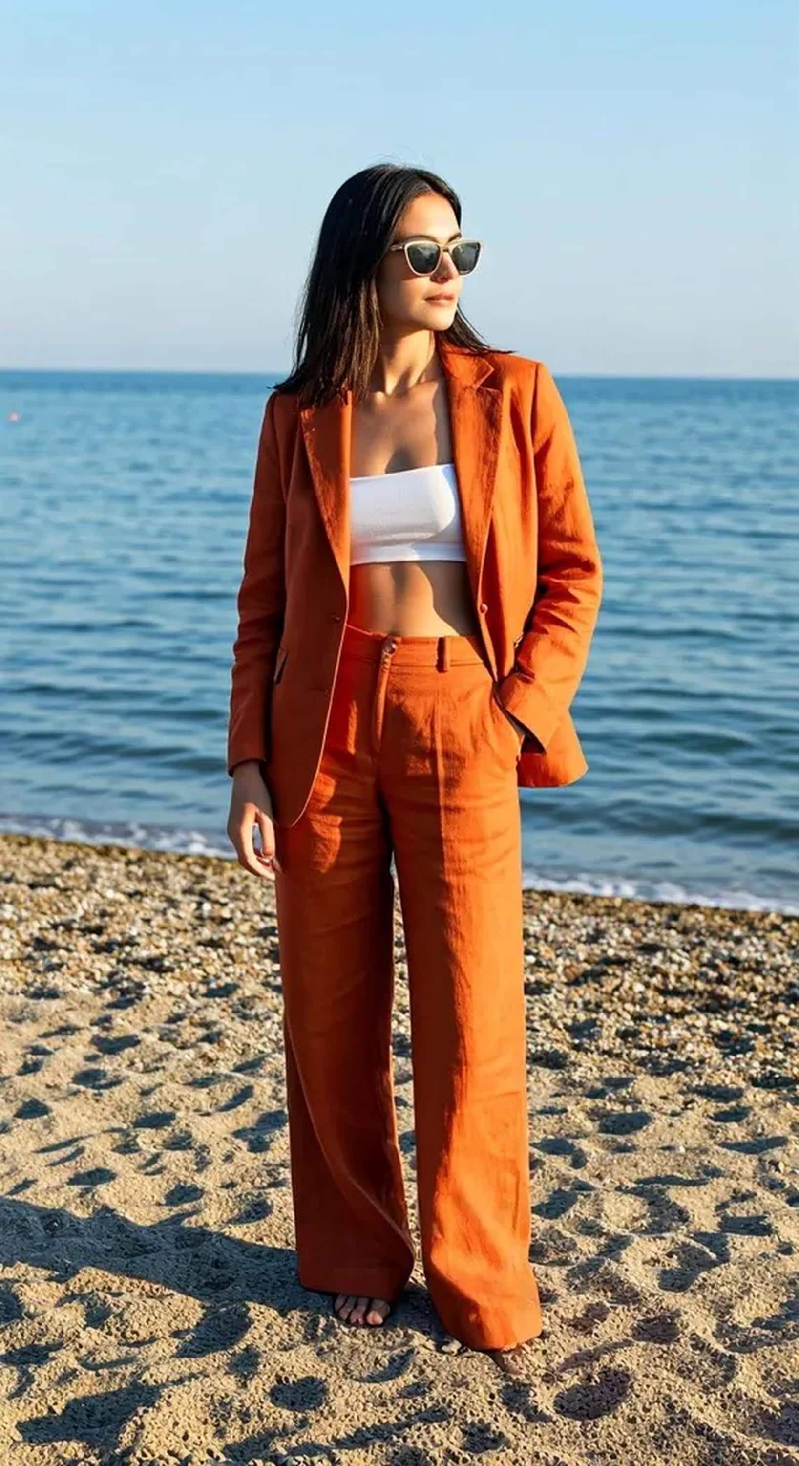 This suit blends relaxed linen texture with a sharp, feminine silhouette — powerful yet easy.