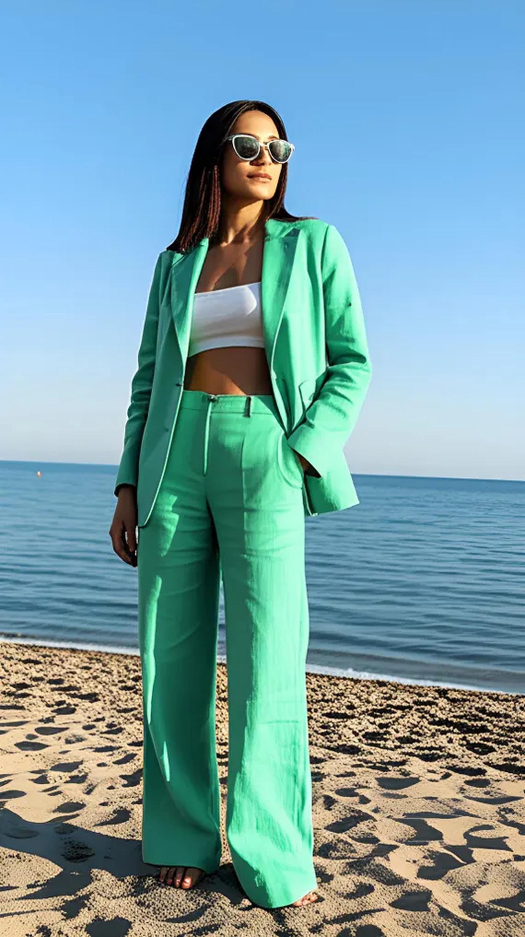 🌿 Mint Green Linen Women’s Suit – Lightweight Blazer & Pants Set