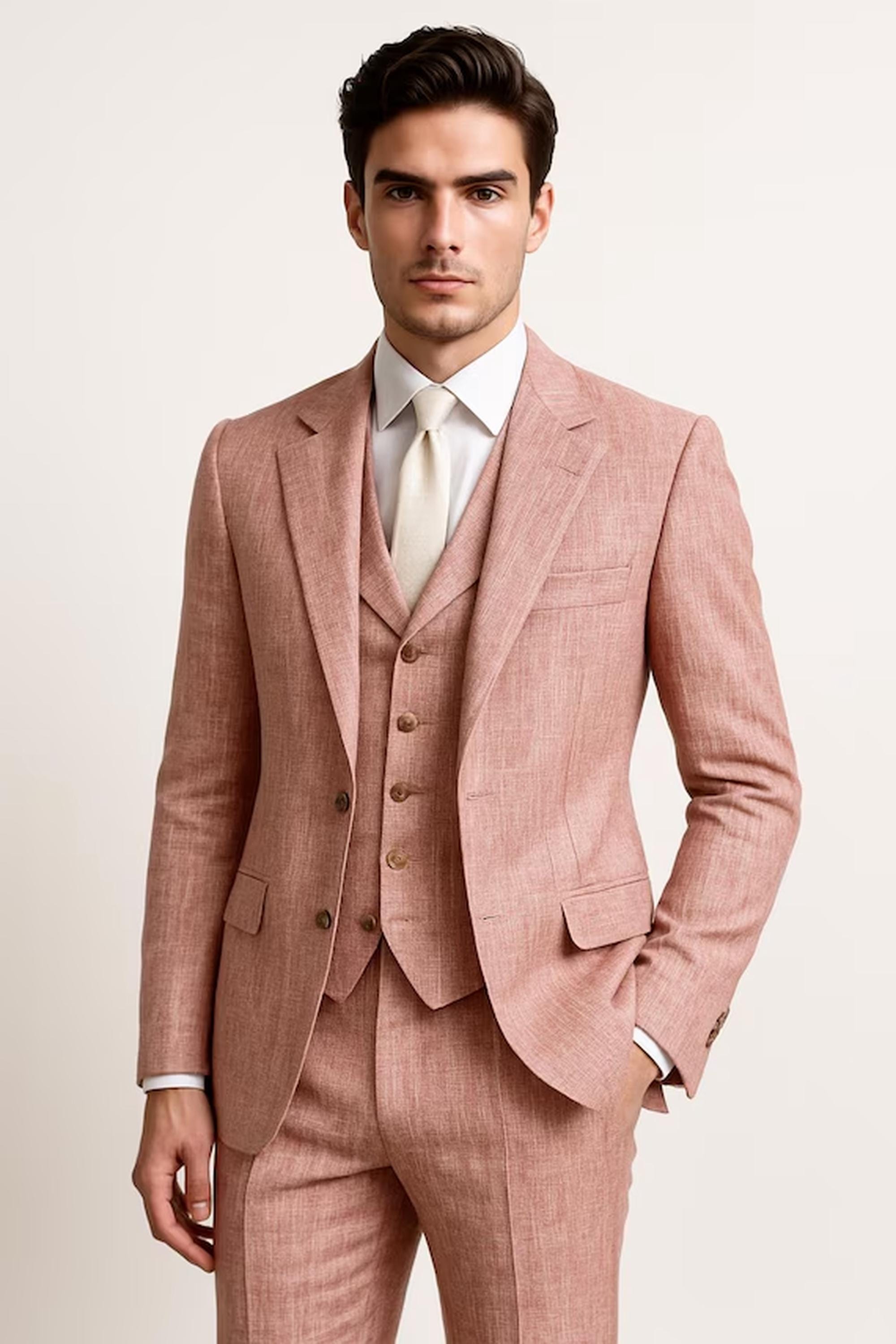 handwoven khadi cotton suit, khadi cotton men’s suit, sustainable men’s suit, light pink khadi suit, eco-friendly menswear, handloom cotton 3-piece suit, ethical fashion men